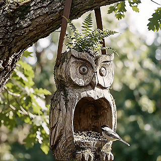 Made from durable resin with a faux-wood texture, it gives you that warm, natural “wood look” without the worry. 🌳✨It’s easier to maintain outdoors, keeps its shape well, and still blends perfectly into real garden scenery. 🏡🦉