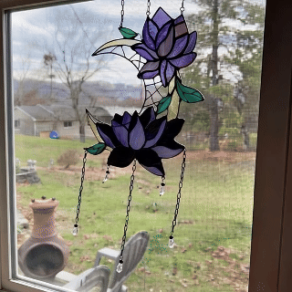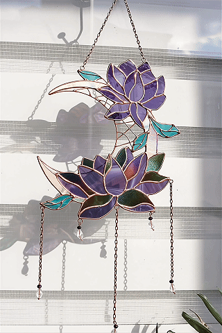 Step into a world of serene beauty with our Purple Lotus & Moon Dreamcatcher, an exquisite stained glass masterpiece that merges timeless tradition with artistic elegance. 🌙✨ This decor piece reflects light beautifully, creating peaceful, shimmering rainbows when sunlight dances through its iridescent glass panels. 🌈💜