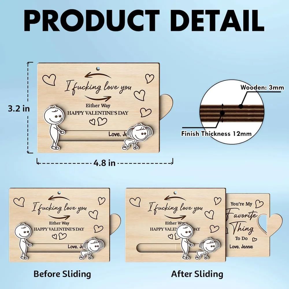 Turn up the heat and add some naughty fun to your love this Valentine's! 😂 This hilarious wooden slider card features adorable stick figures that slide to reveal a playful, adult-themed surprise – the perfect way to say "I love you" with a wink and a grin. Shoppers absolutely rave about how it brings instant laughter and becomes an instant favorite keepsake. 💑Personalize it with your own message to make the moment even more intimate and unforgettable! ✨