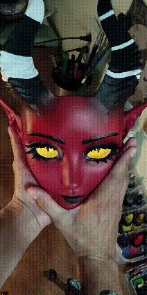 Detail Design: The exaggerated pointed ears and upward-curving black horns enhance the demonic characteristics. The eyelashes around the eyes are finely crafted, with the yellow irises featuring highlights. The matte texture of the cheeks contrasts with the glossy eyes, enriching the visual layers.